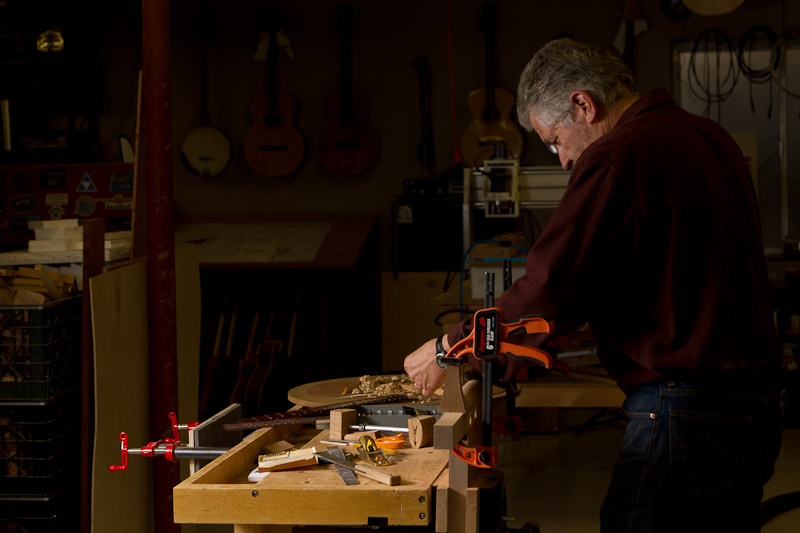 I spent the day documenting the craftsmanship of Colorado luthier James Einolf in his basement workshop. An astounding amount of very fine, detailed woodworking is required to handcraft a guitar. After hundreds of hours of labor, it’s astonishing that all the pieces eventually come together into a musical instrument.