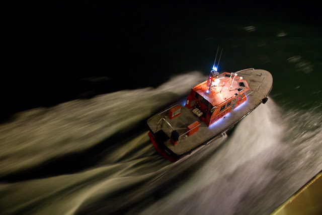 Anyway, everyone (but me) enjoyed the Boston Aquarium, and I joined them for lunch at Bertucci’s. Walking the 2.5 miles back to the ship was entertaining, as Little Man Tate decided that walking wasn’t so high on his priority list. In preparation for departing the Port of Boston, all passengers must undergo ‘muster’ training, that is, learning the procedures for abandoning ship via the ship’s life boats, the largest four of which hold 150 people each. After dinner as the last light faded from the western sky, the kids waited for a tugboat to approach the MV Explorer. After watching the tug maneuver around and attach a line, we told the guy working on the deck of the tug where we were headed, which amazed him. They finally pulled us away from the dock at exactly 9:00 pm, and 15 minutes later we were under way, under our own power, headed for the Atlantic with the Pilot boat cruising alongside. Twenty minutes later I watched the pilot hop off the ship onto the pilot boat, and they both blew their horns as the pilot boat flipped a 180 and returned to the Port of Boston.