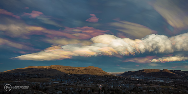 Anyway, sometimes I just have a feeling when something is going to work out, and tonight it was like something was pulling at me to remain outside, despite the dropping temperature and impending dinner guests. I was finishing a 7+ mile hike up and around Mt. Galbraith (sans camera), and as I descended the last 500′ into the neighborhood, the strong northwest winds hitting North Table Mountain were rapidly creating a repeating series of amazing orographic clouds (previously described in a prior post). I got home as quickly as I could to get camera gear, and hoofed it right back up the hill high enough to get above the ‘hood.