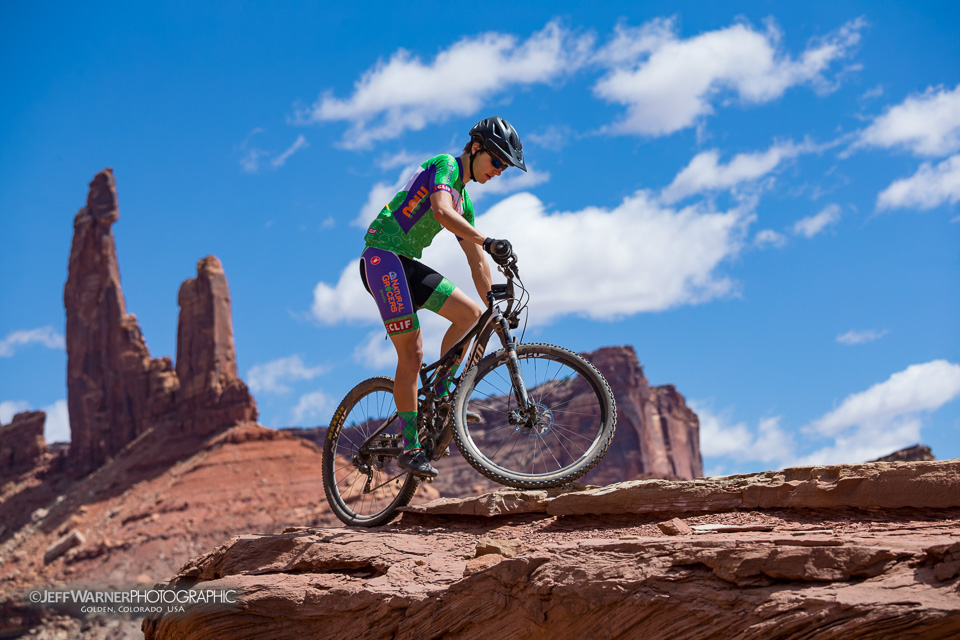 Reade and Andrew ride their mountain bikes up the north side of Hardscrabble Hill, Canyonlands N.P., UT