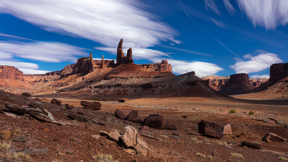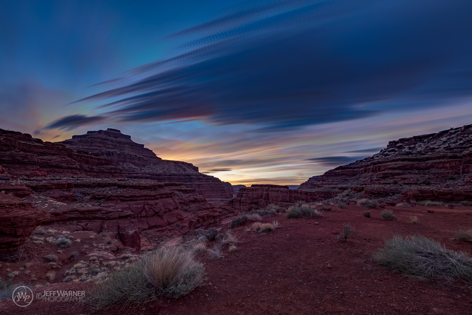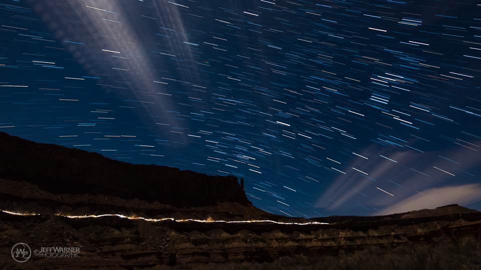 This trip was planned for Spring Break in order to give a few friends the opportunity to ride the White Rim supported, since I was there anyway shooting for a week. I started at Shafer Campground (nearest Moab), and worked my way across, scouting locations and capturing a few daylight landscapes. Met up with the initial portion of the group at Airport, and then Reade and his future off-campus roommate joined us at Hardscrabble. We continued on to Taylor Canyon, spending one ‘breezy’ evening together (term used lightly, we were all huddled low in the sunshade trying not to freeze). Once they left, Tate and Jesse joined me for a night. As scattered mid-level clouds started to roll in once the moon rose, we were treated to a show quite unlike anything I’ve ever seen; the altocumulus clouds rapidly streamed across the sky toward Moses & Zeus, intermittently varying in altitude, giving the appearance of the sky ‘breathing’, as Jupiter rose in the east.