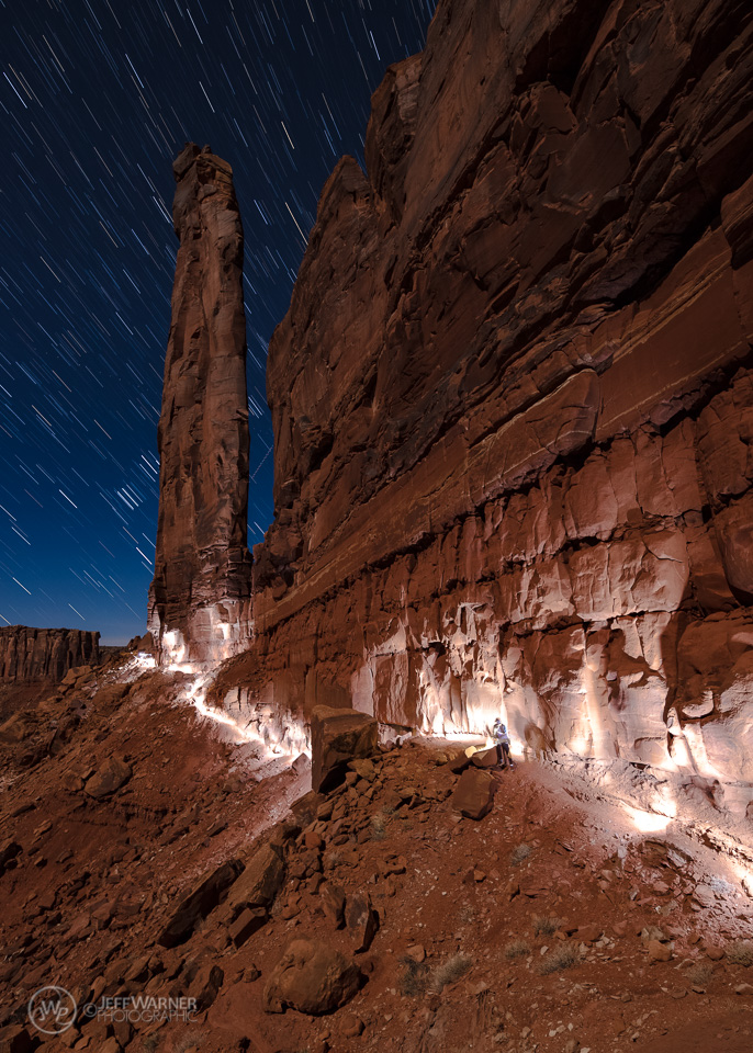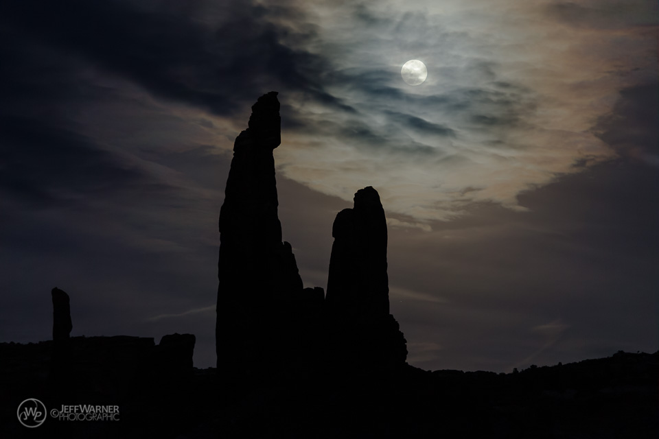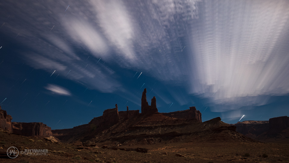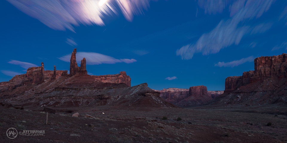 Moonlit clouds over Moses & Zeus, Taylor Canyon, Canyonlands National Park, UT [note lights of poacher backpackers beneath Moses & Zeus]