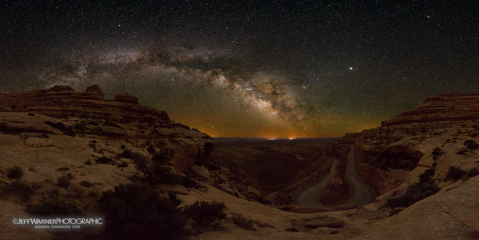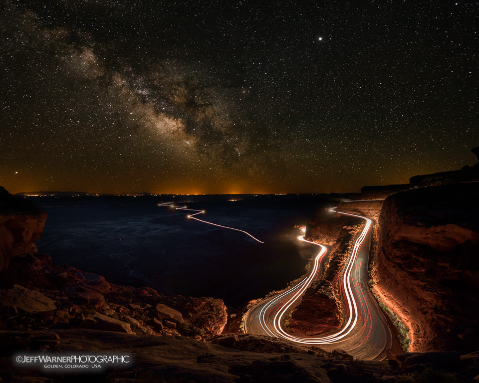 Moki Dugway, on Utah State Route 261, runs between Natural Bridges National Monument and off the edge of Cedar Mesa down into Mexican Hat, UT. It is not a road that is frequently traveled due to it being a bit off the grid, but those who know of it often go out of their way to drive the steep gravel switchbacks, at the bottom of which is the west entrance to Valley of the Gods. I’ve always wanted to return to this spot after driving it 25+ years ago, and the Milky Way was in a perfect location for some images.