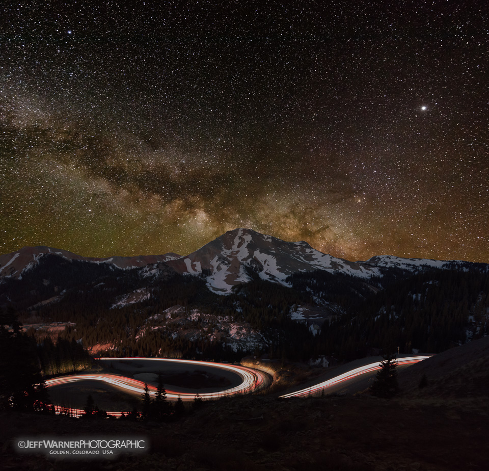 Milky Way rises over light trails from cars driving Red Mountain Pass switchbacks, near Ouray, CO